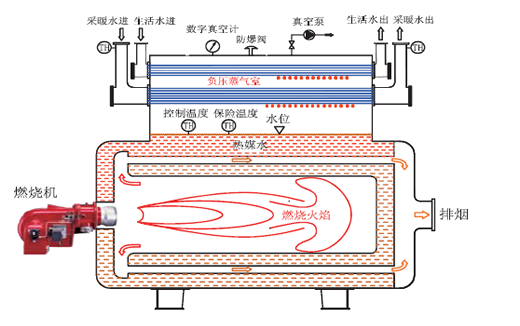 工作原理即通過抽取真空,形成一個幾乎沒有空氣的低壓環境,然后利用水在低壓(低于大氣壓)低溫沸騰產生蒸汽,通過汽水凝結換熱方式將熱量輸出的原理工作的。